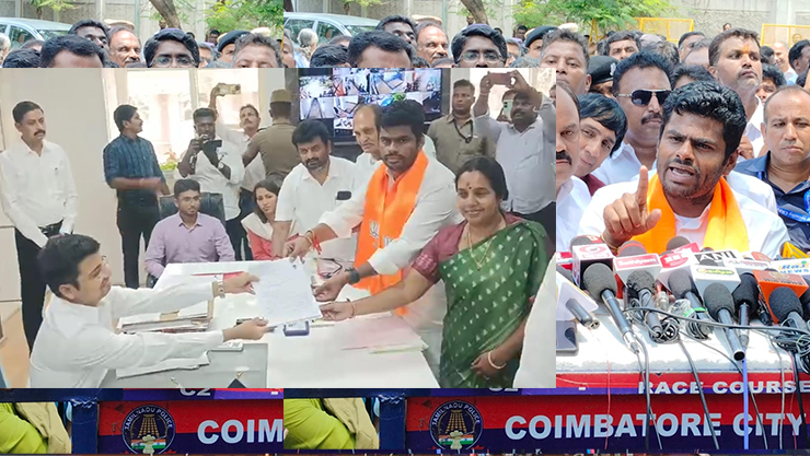 பாராளுமன்ற தொகுதியில் போட்டியிடும் பாஜக வேட்பாளர் அண்ணாமலை தனது வேட்பு மனுவை மாவட்ட ஆட்சியரும் மாவட்ட தேர்தல் நடத்தும் அலுவலருமான கிராந்தி குமார் பாடியிடம் தாக்கல் செய்தார்.