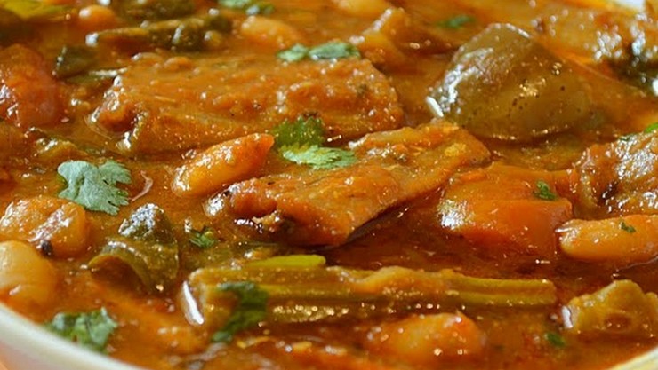 5 நிமிடம் தக்காளி நன்கு வதங்கும் வரை வதக்கி விடவேண்டும். கறிவேப்பிலையைச் சேர்த்து வதக்கவும். இப்போது புளிக்கரைசல் மற்றும் விழுது கலவையை ஊற்றவும். 1/2 டம்ளர் தண்ணீர் சேர்த்து நன்கு கொதிக்க விடவேண்டும்.