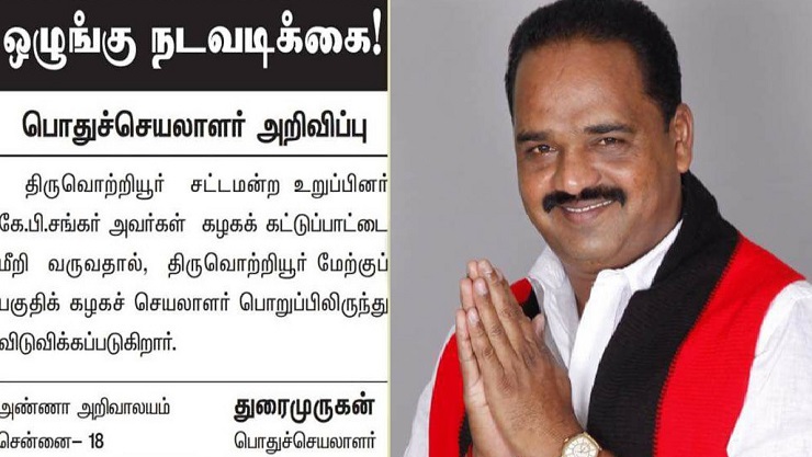 கட்சி கட்டுப்பாட்டை மீறி செயல்பட்டதன் காரணமாக திருவொற்றியூர் திமுக எம்எல்ஏ கேபி சங்கர் திருவொற்றியூர் மேற்கு பகுதி செயலாளர் பதவி பொறுப்பில் இருந்து விடுவிக்கப்படுகிறார் என அறிவிக்கப்பட்டுள்ளது