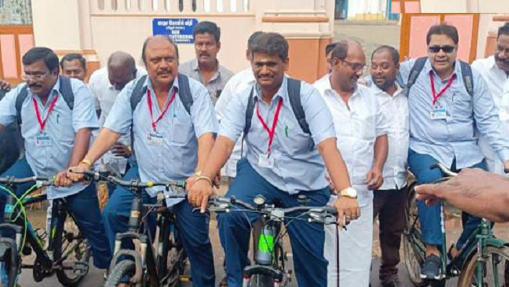 இந்த நிலையில் அரசு பள்ளி மாணவர்களுக்கு உடனடியாக சைக்கிள் லேப்டாப் மற்றும் சீருடைகள் வழங்க வேண்டும் என பள்ளி சீருடை அணிந்து பள்ளி மாணவர்கள் போல் பை மாட்டிக் கொண்டு சைக்கிளில் திமுக எம்எல்ஏக்கள் சட்டப்பேரவைக்கு வந்ததால் பெரும் பரபரப்பு ஏற்பட்டுள்ளது.