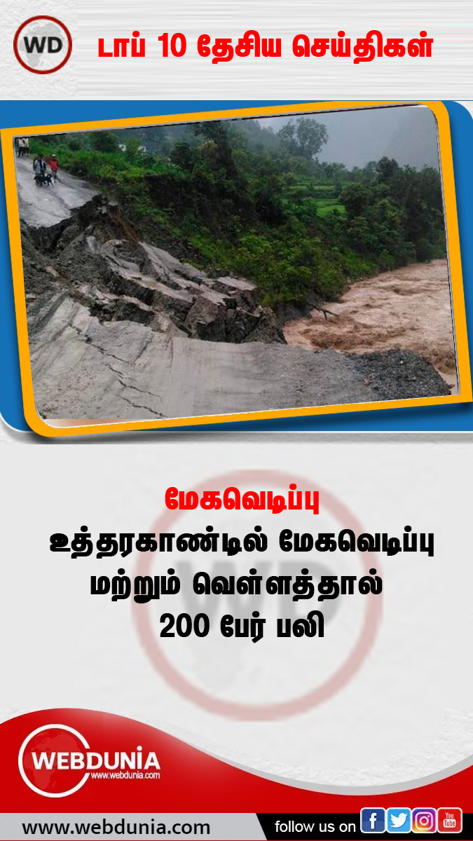 உத்தரகாண்ட் மாநிலத்தின் ராம்கர் பகுதியில் ஏற்பட்ட திடீர் மேகவெடிப்பால் நிலச்சரிவு, வெள்ளம் ஏற்பட்டது. பல வீடுகள், குடியிருப்புகள் வெள்ளத்தில் மூழ்கிய நிலையில் சுமார் 200க்கும் அதிகமானோர் இந்த விபத்தில் உயிரிழந்தனர்.