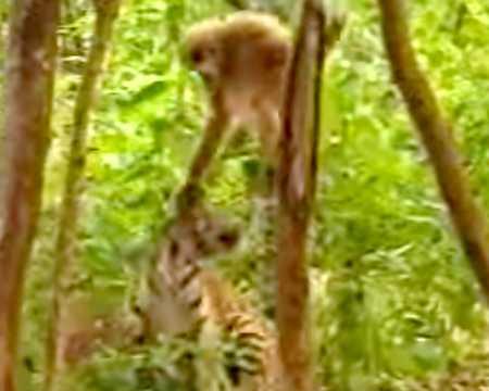 குரங்கு சேட்டையை பார்த்திருகிறீர்களா? - இரண்டு புலிகளை விரட்டும் குரங்கை பாருங்கள்! [வீடியோ]